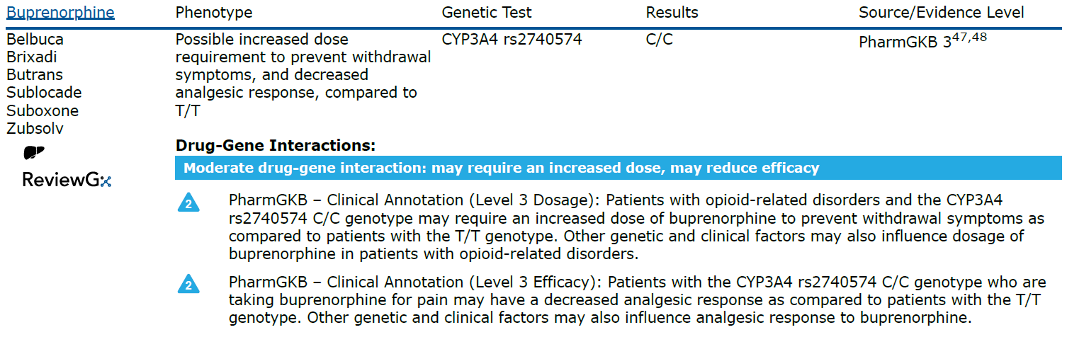 Buprenorphine drug-gene interaction content is now available for panels testing CYP3A4 rs2740574, based on ClinPGx (PharmGKB) Level 3 evidence. Learn more: https://www.clinpgx.org/combination/PA130,PA448685/summaryAnnotation