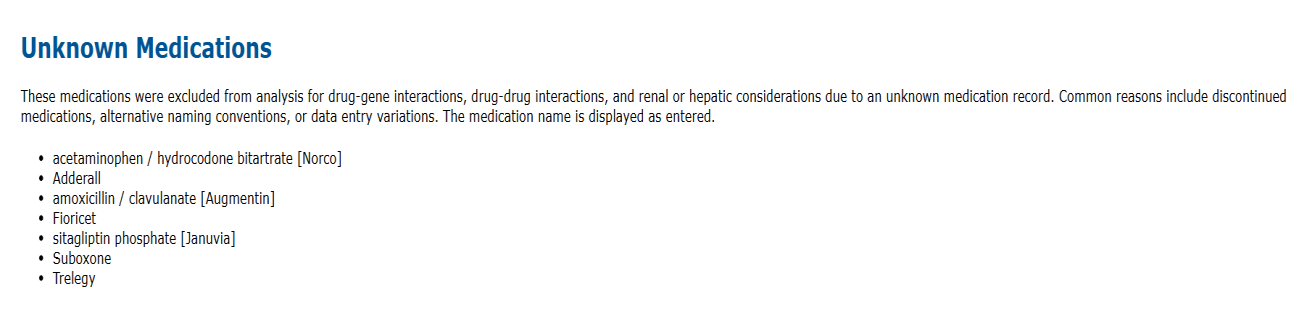 Note: These medications were excluded from analysis for drug-gene interactions, drug-drug interactions, and renal or hepatic considerations due to an unknown medication record. Common reasons include discontinued medications, alternative naming conventions, or data entry variations. The medication name is displayed as entered.